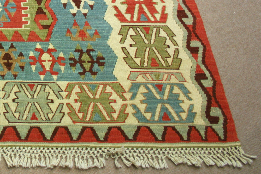 スタンダードキリムより、ワンランク上のカイセリキリム。カイセリ地方で織られているキリムです。上質のウールで織られているため、手触りもやわらか。細かなモチーフがぎっしり詰め込まれ、繊細に織られていて、古いキリムの色合いに合わせたパステル調の色合いが特徴です。機械織りとは異なり、暖かみが伝わるハンドメイド。このタイプのものは、なかなか数が少なく、品質・価格・品揃え共に、日本国内屈指であると自負しています。