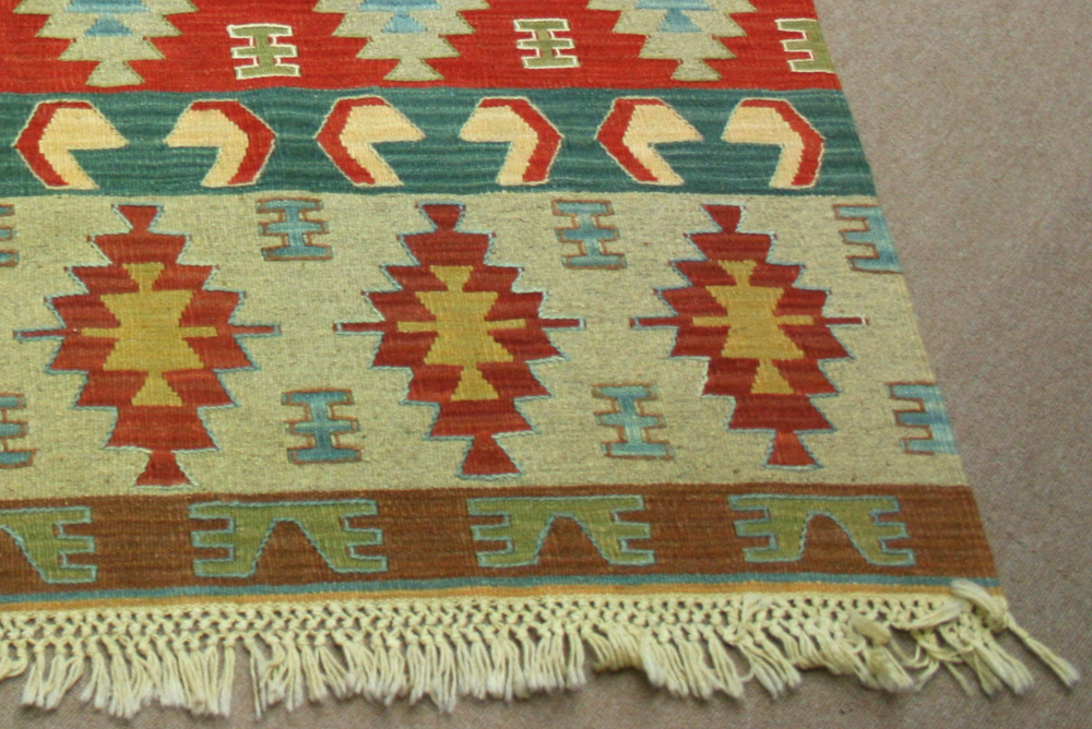 スタンダードキリムより、ワンランク上のカイセリキリム。カイセリ地方で織られているキリムです。上質のウールで織られているため、手触りもやわらか。細かなモチーフがぎっしり詰め込まれ、繊細に織られていて、古いキリムの色合いに合わせたパステル調の色合いが特徴です。機械織りとは異なり、暖かみが伝わるハンドメイド。このタイプのものは、なかなか数が少なく、品質・価格・品揃え共に、日本国内屈指であると自負しています。