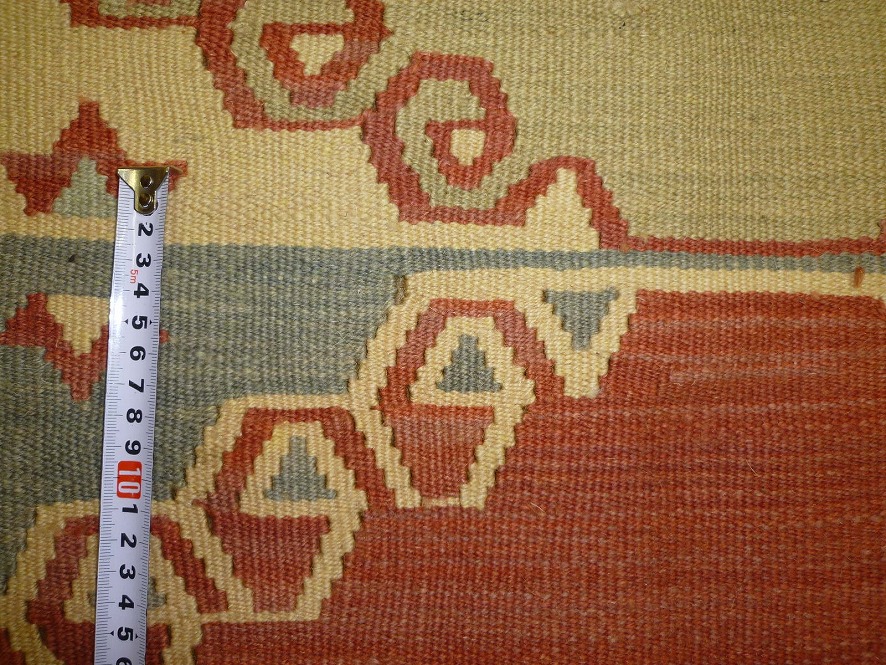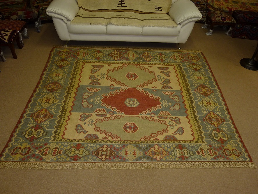 スタンダードキリムより、ワンランク上のカイセリキリム。カイセリ地方で織られているキリムです。上質のウールで織られているため、手触りもやわらか。細かなモチーフがぎっしり詰め込まれ、繊細に織られていて、古いキリムの色合いに合わせたパステル調の色合いが特徴です。機械織りとは異なり、暖かみが伝わるハンドメイド。正方形のキリムはめずらしく、この大きさのキリムは日本向けに作ってもらったものです!ホットカーペットの上にいかがでしょうか。このタイプのものは、なかなか数が少なく、品質・価格・品揃え共に、日本国内屈指であると自負しています。