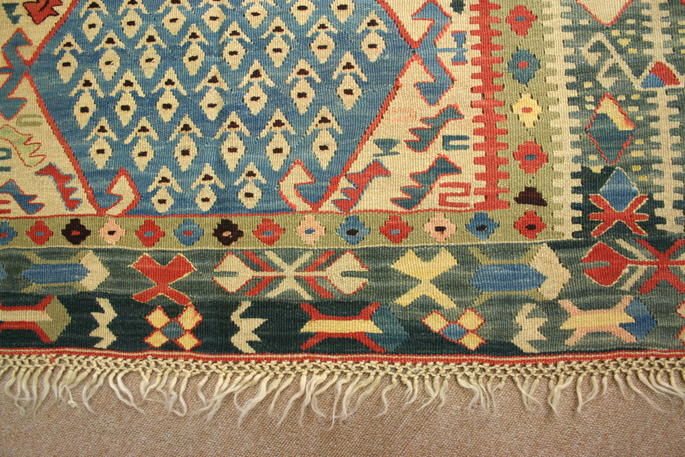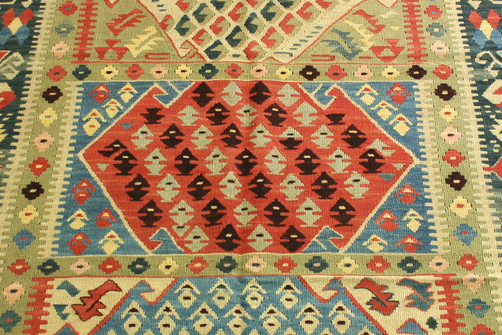 スタンダードキリムより、ワンランク上のカイセリキリム。カイセリ地方で織られているキリムです。上質のウールで織られているため、手触りもやわらか。細かなモチーフがぎっしり詰め込まれ、繊細に織られていて、古いキリムの色合いに合わせたパステル調の色合いが特徴です。機械織りとは異なり、暖かみが伝わるハンドメイド。このタイプのものは、なかなか数が少なく、品質・価格・品揃え共に、日本国内屈指であると自負しています。