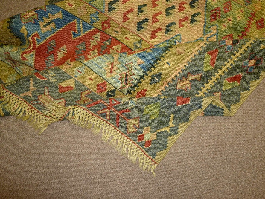 スタンダードキリムより、ワンランク上のカイセリキリム。カイセリ地方で織られているキリムです。上質のウールで織られているため、手触りもやわらか。細かなモチーフがぎっしり詰め込まれ、繊細に織られていて、古いキリムの色合いに合わせたパステル調の色合いが特徴です。機械織りとは異なり、暖かみが伝わるハンドメイド。このタイプのものは、なかなか数が少なく、品質・価格・品揃え共に、日本国内屈指であると自負しています。