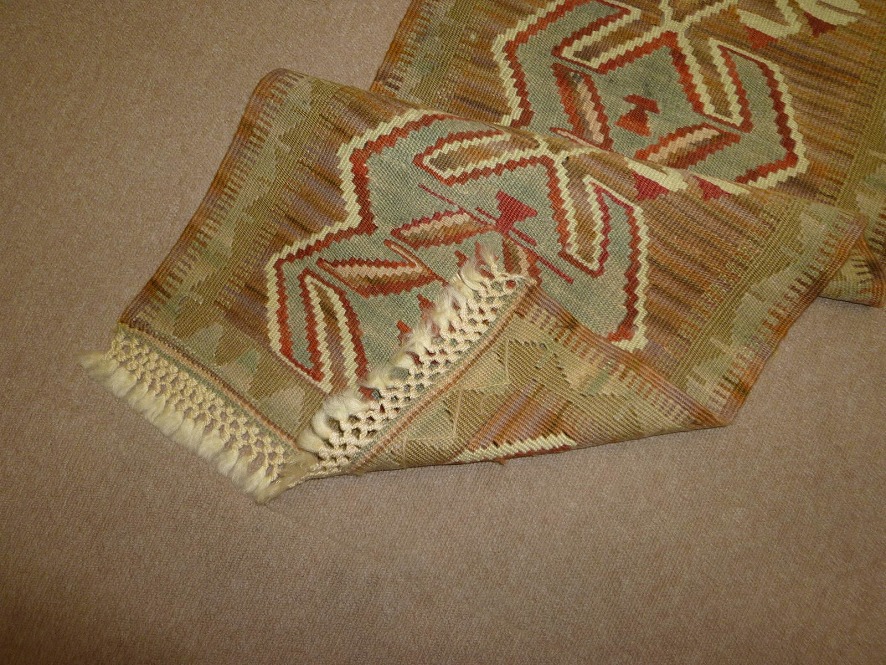 スタンダードキリムより、ワンランク上のカイセリキリム。カイセリ地方で織られているキリムです。上質のウールで織られているため、手触りもやわら か。細かなモチーフがぎっしり詰め込まれ、繊細に織られていて、古いキリムの色合いに合わせたパステル調の色合いが特徴です。機械織りとは異なり、暖かみ が伝わるハンドメイド。このタイプのものは、なかなか数が少なく、品質・価格・品揃え共に、日本国内屈指で あると自負しています。
