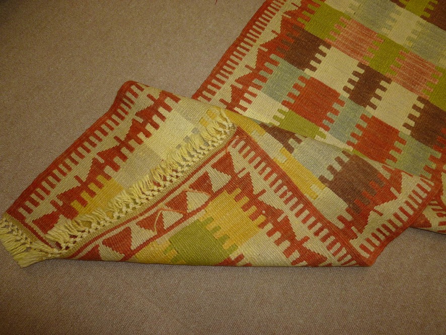 スタンダードキリムより、ワンランク上のカイセリキリム。カイセリ地方で織られているキリムです。上質のウールで織られているため、手触りもやわら か。細かなモチーフがぎっしり詰め込まれ、繊細に織られていて、古いキリムの色合いに合わせたパステル調の色合いが特徴です。機械織りとは異なり、暖かみ が伝わるハンドメイド。このタイプのものは、なかなか数が少なく、品質・価格・品揃え共に、日本国内屈指で あると自負しています。