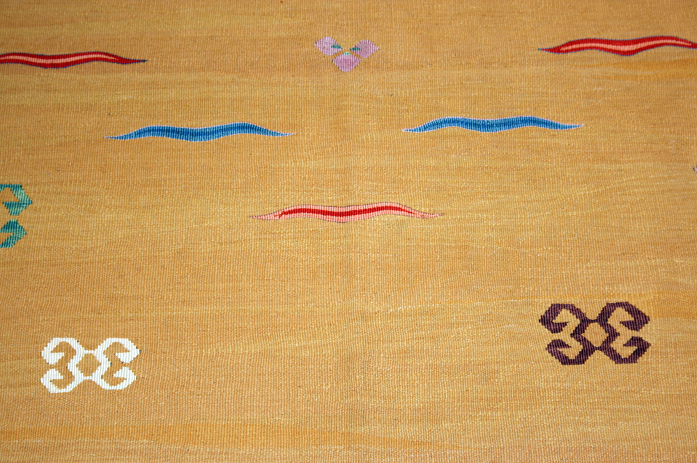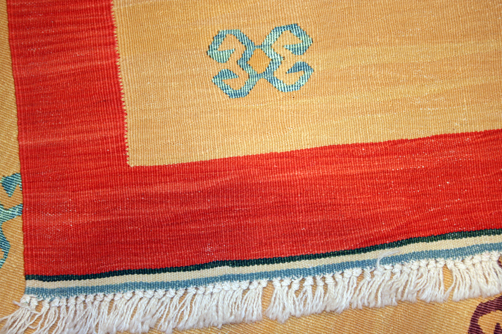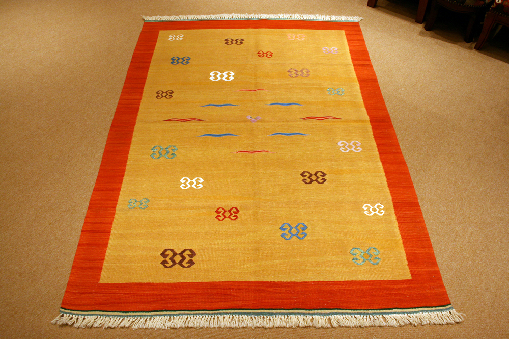ニューキリム(新品)です。使いこむほどに風合いを重ね、アンティーク感が出てくるのがキリムの醍醐味。本キリムに使用の糸は、手紡ぎ・草木染めです。ハンドメイドならではの素朴な味わいと、柔らかい手触り。「機械織りでは味わえない暖かみ」をお楽しみ頂ける逸品です。