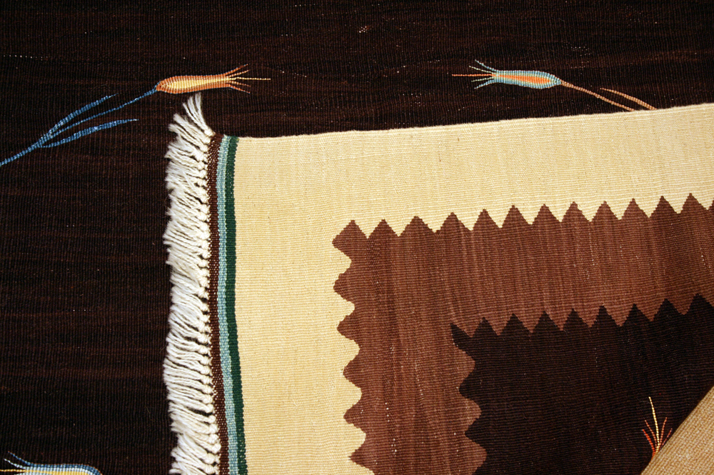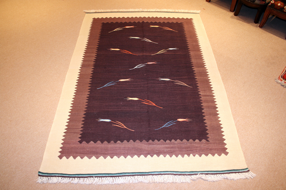 ニューキリム(新品)です。使いこむほどに風合いを重ね、アンティーク感が出てくるのがキリムの醍醐味。本キリムに使用の糸は、手紡ぎ・草木染めです。ハンドメイドならではの素朴な味わいと、柔らかい手触り。「機械織りでは味わえない暖かみ」をお楽しみ頂ける逸品です。