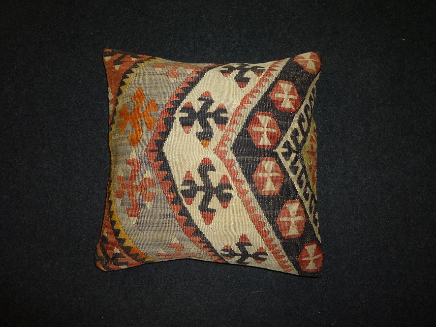 キリムクッションカバー[m-168] オールドキリムを使用して作られた、エキゾチックなクッションカバー。オールドキリムの素敵な部分をカットして使用されています。(表面はオールドキリム、裏側はコットンの布地です)お手持ちの家具やキリムと組み合わせてお楽しみください。このタイプのものは、なかなか数が少な く、品質・価格・品揃え共に日本国内屈指であると自負しています。この商品は現地でクリーニングしてから輸入していますのでご安心ください。