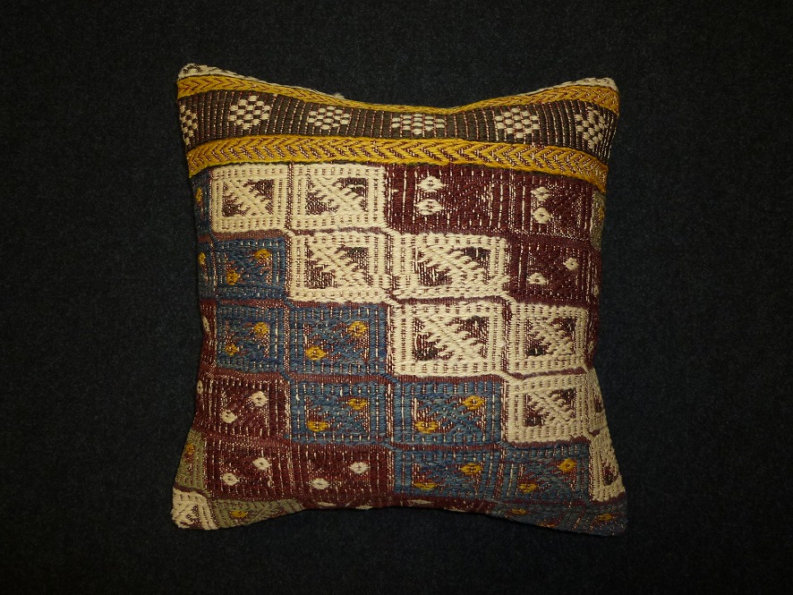 キリムクッションカバー[m-183] オールドキリムを使用して作られた、エキゾチックなクッションカバー。オールドキリムの素敵な部分をカットして使用されています。(表面はオールドキリム、裏側はコットンの布地です)お手持ちの家具やキリムと組み合わせてお楽しみください。このタイプのものは、なかなか数が少な く、品質・価格・品揃え共に日本国内屈指であると自負しています。この商品は現地でクリーニングしてから輸入していますのでご安心ください。