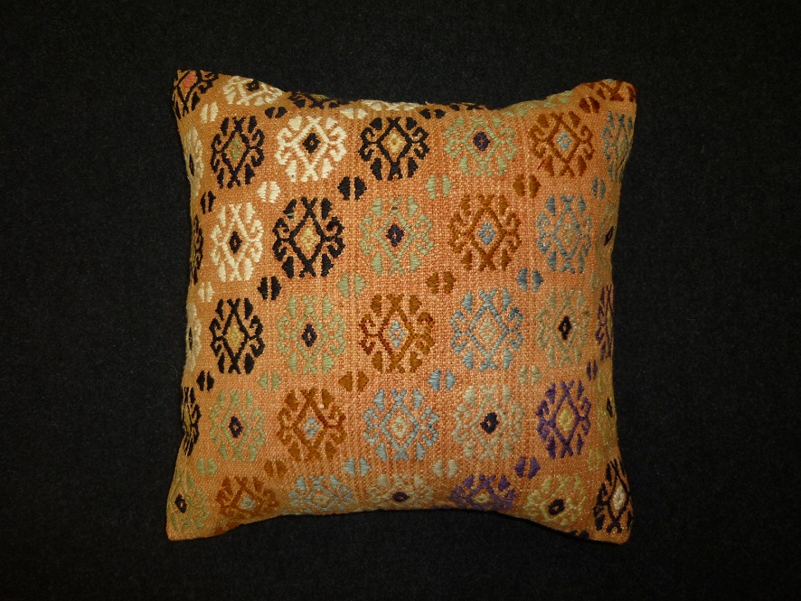 キリムクッションカバー[m-92] オールドキリムを使用して作られた、エキゾチックなクッションカバー。オールドキリムの素敵な部分をカットして使用されています。(表面はオールドキリム、裏側はコットンの布地です)お手持ちの家具やキリムと組み合わせてお楽しみください。このタイプのものは、なかなか数が少な く、品質・価格・品揃え共に日本国内屈指であると自負しています。この商品は現地でクリーニングしてから輸入していますのでご安心ください。