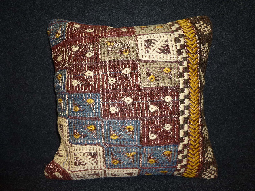 キリムクッションカバー[m11] オールドキリムを使用して作られた、エキゾチックなクッションカバー。オールドキリムの素敵な部分をカットして使用されています。(表面はオールドキリム、裏側はコットンの布地です)お手持ちの家具やキリムと組み合わせてお楽しみください。このタイプのものは、なかなか数が少な く、品質・価格・品揃え共に日本国内屈指であると自負しています。この商品は現地でクリーニングしてから輸入していますのでご安心ください。