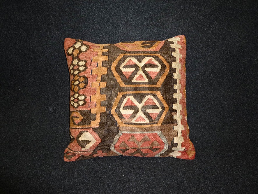 オールドキリムを使用して作られた、エキゾチックなクッションカバー。オールドキリムの素敵な部分をカットして使用されています。(表面はオールドキリム、裏側はコットンの布地です)お手持ちの家具やキリムと組み合わせてお楽しみください。このタイプのものは、なかなか数が少な く、品質・価格・品揃え共に日本国内屈指であると自負しています。この商品は現地でクリーニングしてから輸入していますのでご安心ください。