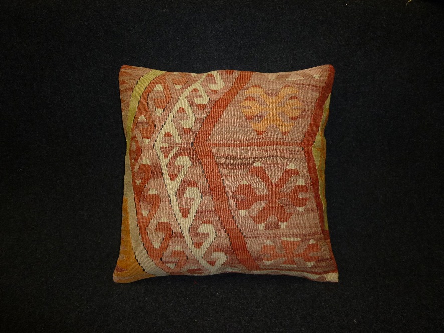 オールドキリムを使用して作られた、エキゾチックなクッションカバー。オールドキリムの素敵な部分をカットして使用されています。(表面はオールドキリム、裏側はコットンの布地です)お手持ちの家具やキリムと組み合わせてお楽しみください。このタイプのものは、なかなか数が少な く、品質・価格・品揃え共に日本国内屈指であると自負しています。この商品は現地でクリーニングしてから輸入していますのでご安心ください。