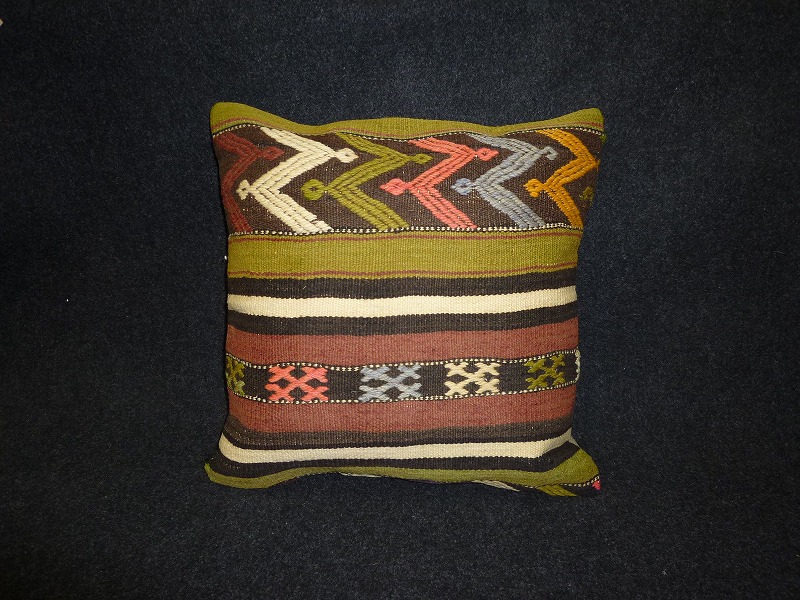 オールドキリムを使用して作られた、エキゾチックなクッションカバー。オールドキリムの素敵な部分をカットして使用されています。(表面はオールドキリム、裏側はコットンの布地です)お手持ちの家具やキリムと組み合わせてお楽しみください。このタイプのものは、なかなか数が少な く、品質・価格・品揃え共に日本国内屈指であると自負しています。この商品は現地でクリーニングしてから輸入していますのでご安心ください。