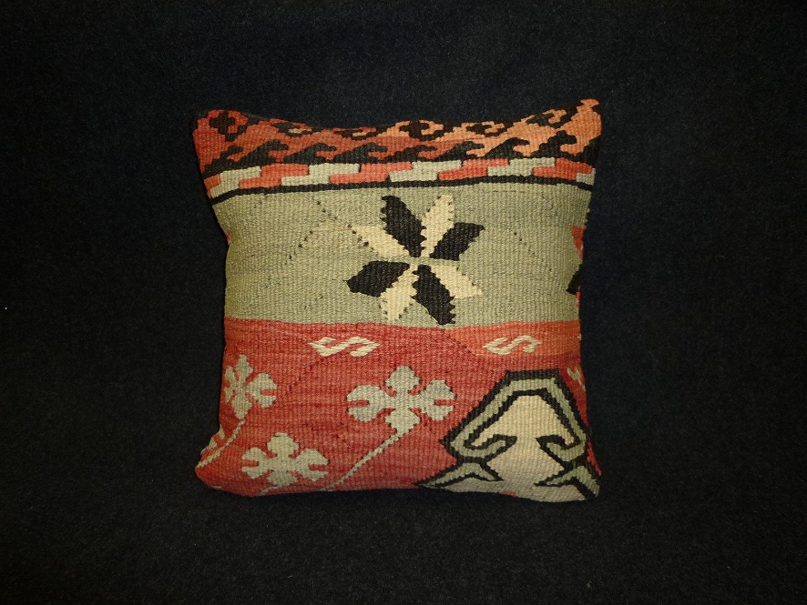 オールドキリムを使用して作られた、エキゾチックなクッションカバー。オールドキリムの素敵な部分をカットして使用されています。(表面はオールドキリム、裏側はコットンの布地です)お手持ちの家具やキリムと組み合わせてお楽しみください。このタイプのものは、なかなか数が少な く、品質・価格・品揃え共に日本国内屈指であると自負しています。この商品は現地でクリーニングしてから輸入していますのでご安心ください。