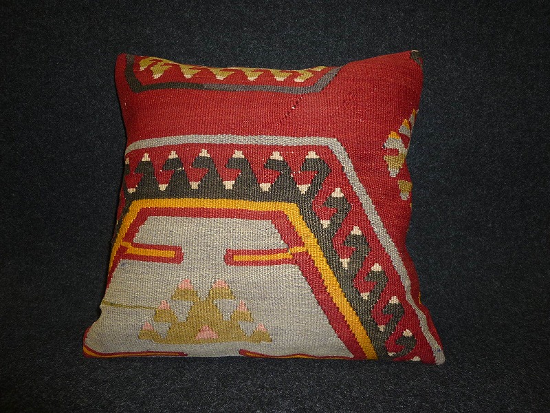 キリムクッションカバー[m-604] オールドキリムを使用して作られた、エキゾチックなクッションカバー。オールドキリムの素敵な部分をカットして使用されています。(表面はオールドキリム、裏側はコットンの布地です)お手持ちの家具やキリムと組み合わせてお楽しみください。このタイプのものは、なかなか数が少な く、品質・価格・品揃え共に日本国内屈指であると自負しています。この商品は現地でクリーニングしてから輸入していますのでご安心ください。