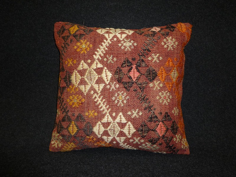 キリムクッションカバー[m-636] オールドキリムを使用して作られた、エキゾチックなクッションカバー。オールドキリムの素敵な部分をカットして使用されています。(表面はオールドキリム、裏側はコットンの布地です)お手持ちの家具やキリムと組み合わせてお楽しみください。このタイプのものは、なかなか数が少な く、品質・価格・品揃え共に日本国内屈指であると自負しています。この商品は現地でクリーニングしてから輸入していますのでご安心ください。