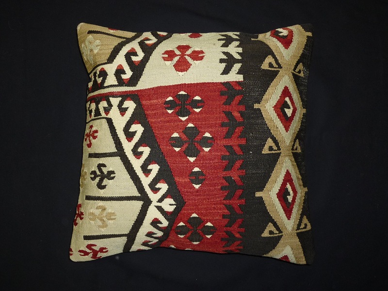 キリムクッションカバー[m767] オールドキリムを使用して作られた、エキゾチックなクッションカバー。オールドキリムの素敵な部分をカットして使用されています。(表面はオールドキリム、裏側はコットンの布地です)お手持ちの家具やキリムと組み合わせてお楽しみください。このタイプのものは、なかなか数が少な く、品質・価格・品揃え共に日本国内屈指であると自負しています。この商品は現地でクリーニングしてから輸入していますのでご安心ください。