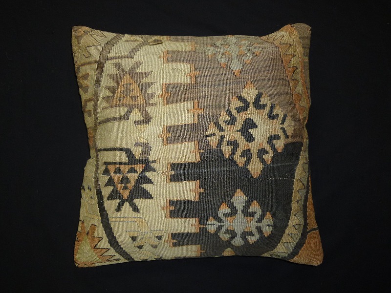 キリムクッションカバーm795] オールドキリムを使用して作られた、エキゾチックなクッションカバー。オールドキリムの素敵な部分をカットして使用されています。(表面はオールドキリム、裏側はコットンの布地です)お手持ちの家具やキリムと組み合わせてお楽しみください。このタイプのものは、なかなか数が少な く、品質・価格・品揃え共に日本国内屈指であると自負しています。この商品は現地でクリーニングしてから輸入していますのでご安心ください。