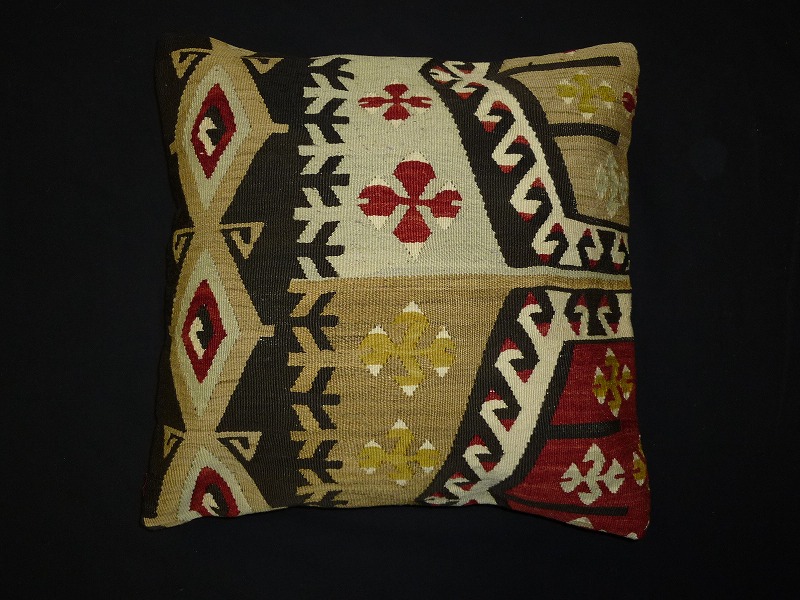 キリムクッションカバー[m836] オールドキリムを使用して作られた、エキゾチックなクッションカバー。オールドキリムの素敵な部分をカットして使用されています。(表面はオールドキリム、裏側はコットンの布地です)お手持ちの家具やキリムと組み合わせてお楽しみください。このタイプのものは、なかなか数が少な く、品質・価格・品揃え共に日本国内屈指であると自負しています。この商品は現地でクリーニングしてから輸入していますのでご安心ください。