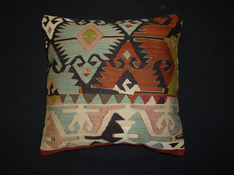 キリムクッションカバー[m839] オールドキリムを使用して作られた、エキゾチックなクッションカバー。オールドキリムの素敵な部分をカットして使用されています。(表面はオールドキリム、裏側はコットンの布地です)お手持ちの家具やキリムと組み合わせてお楽しみください。このタイプのものは、なかなか数が少な く、品質・価格・品揃え共に日本国内屈指であると自負しています。この商品は現地でクリーニングしてから輸入していますのでご安心ください。