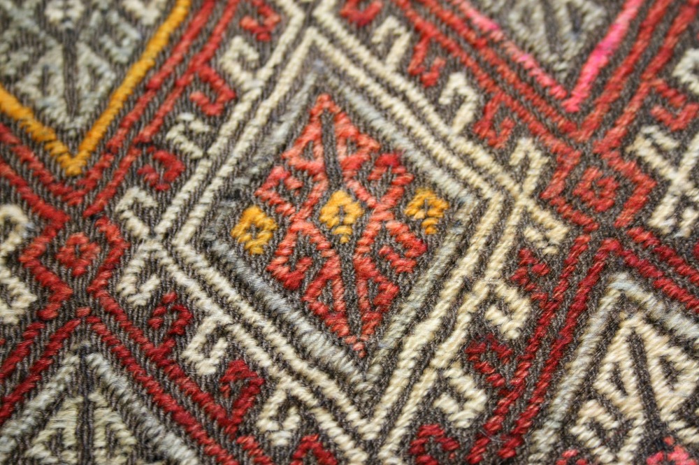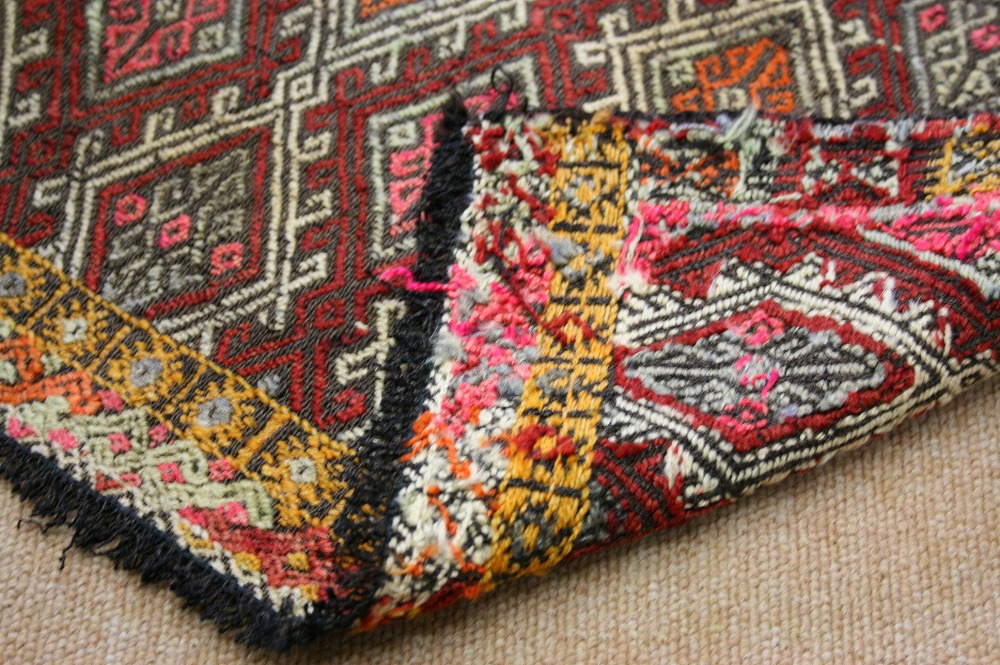 織ってから30~40年経っていますがきれいな状態を保っています。古いキリムですので、色に味があり、手触りもやわらかくなってきています。サイズ的に壁に飾ってもいい感じです。