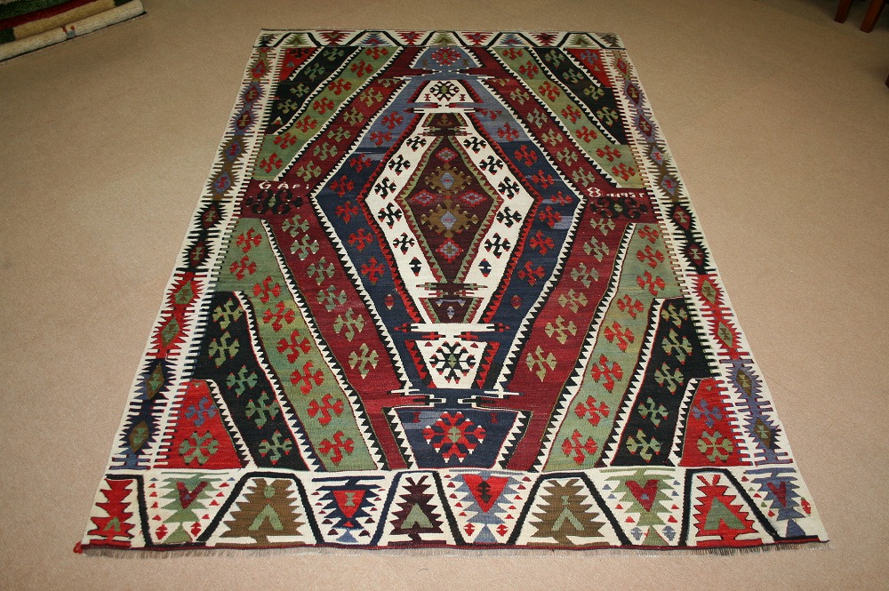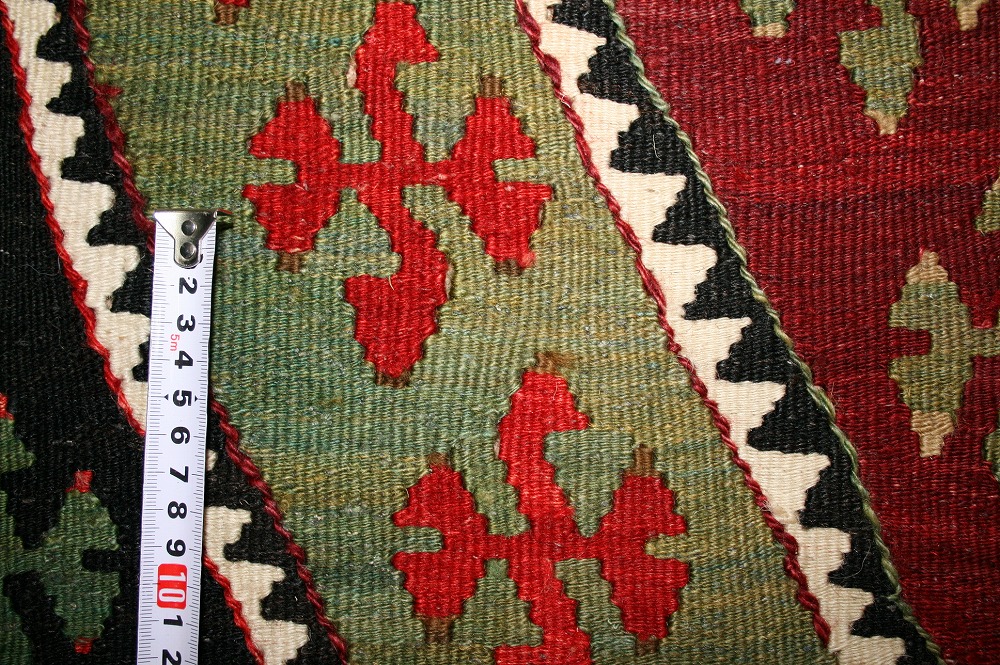 50~60年前のものです。繊細な織りと、大胆なデザインデと色彩。一枚あるだけで、オリジナリティあふれる空間をつくり出してくれます。本キリムに使用の糸は、すべて草木染めです。機械織りとは異なり、暖かみが伝わるハンドメイドです。