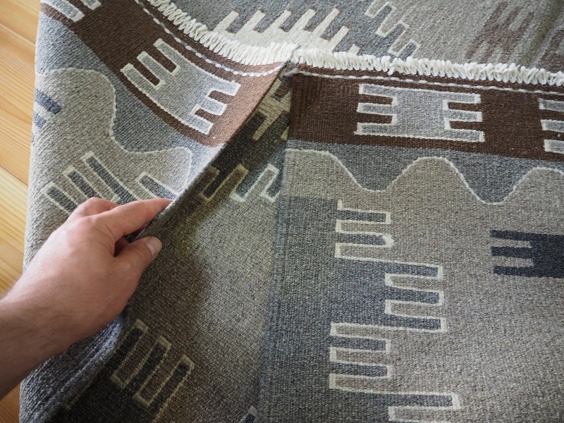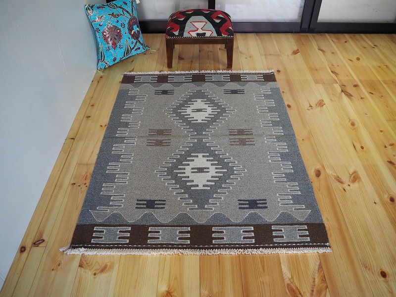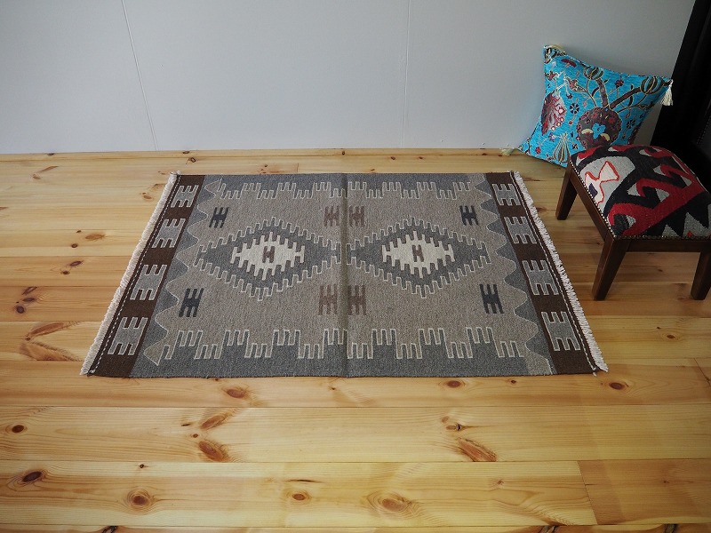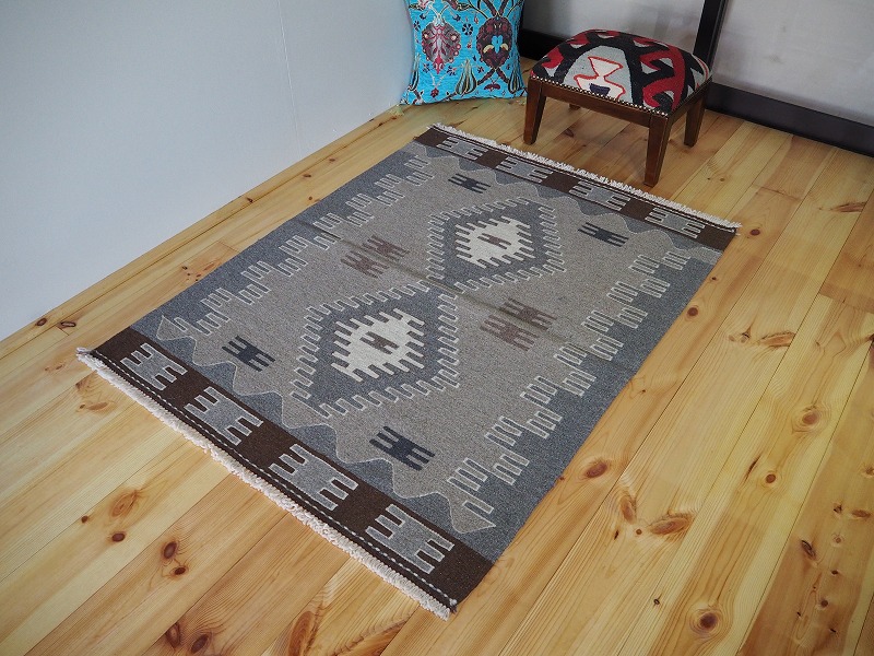 染めていないナチュラルな羊の毛の色だけを使って織られたモノトーンのキリム。こげ茶色、茶色、グレー、ベージュ、オフホワイトの組み合わせて、伝統的なキリムになっています。モダンなお部屋にもあわせやすい人気のカラーです。織りは、細かく隙間のない状態になっています。機械織りとは異なり、暖かみが伝わるハンドメイド。このタイプのものは、なかなか数が少なく、品質・価格・品揃え共に、日本国内屈指であると自負しています。