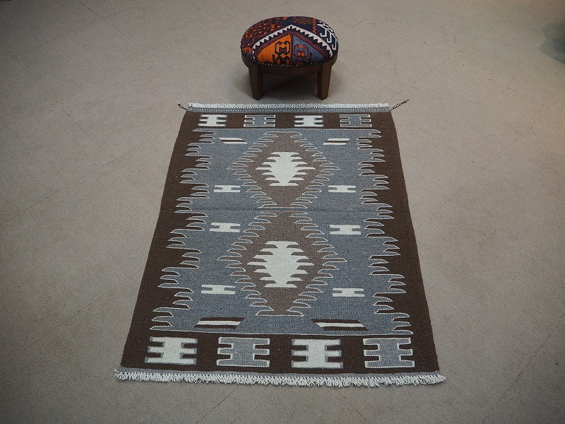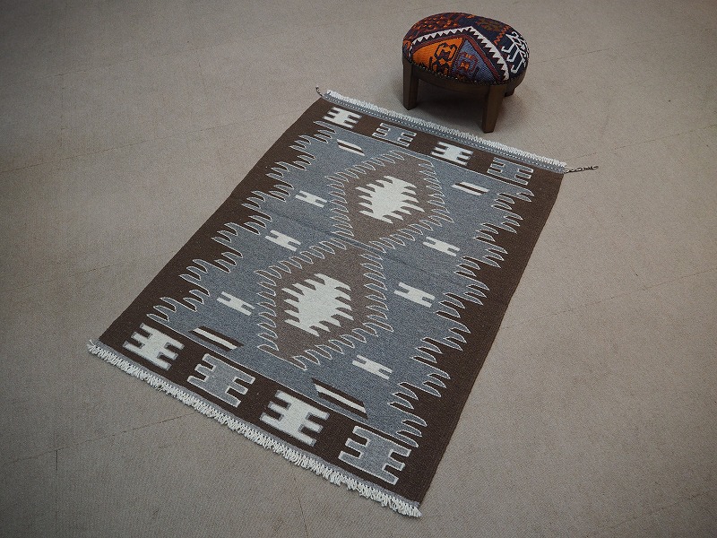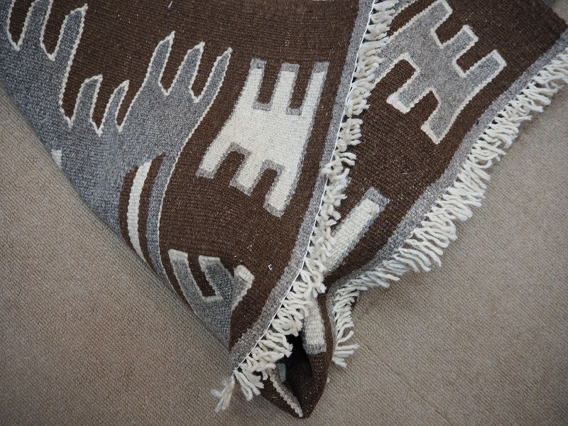 染めていないナチュラルな羊の毛の色だけを使って織られたモノトーンのキリム。こげ茶色、茶色、グレー、ベージュ、オフホワイトの組み合わせて、伝統的なキリムになっています。モダンなお部屋にもあわせやすい人気のカラーです。織りは、細かく隙間のない状態になっています。機械織りとは異なり、暖かみが伝わるハンドメイド。このタイプのものは、なかなか数が少なく、品質・価格・品揃え共に、日本国内屈指であると自負しています。