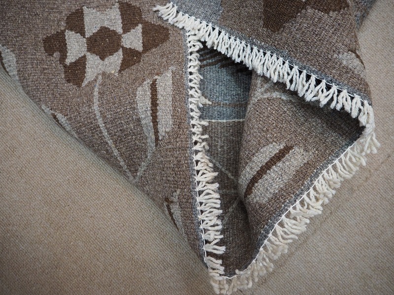 染めていないナチュラルな羊の毛の色だけを使って織られたモノトーンのキリム。こげ茶色、茶色、グレー、ベージュ、オフホワイトの組み合わせて、伝統的なキリムになっています。モダンなお部屋にもあわせやすい人気のカラーです。織りは、細かく隙間のない状態になっています。機械織りとは異なり、暖かみが伝わるハンドメイド。このタイプのものは、なかなか数が少なく、品質・価格・品揃え共に、日本国内屈指であると自負しています。