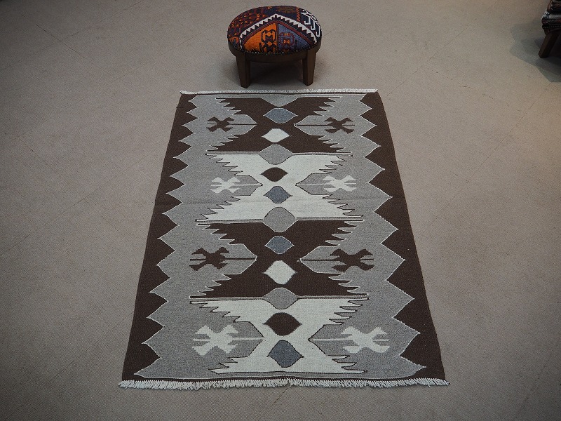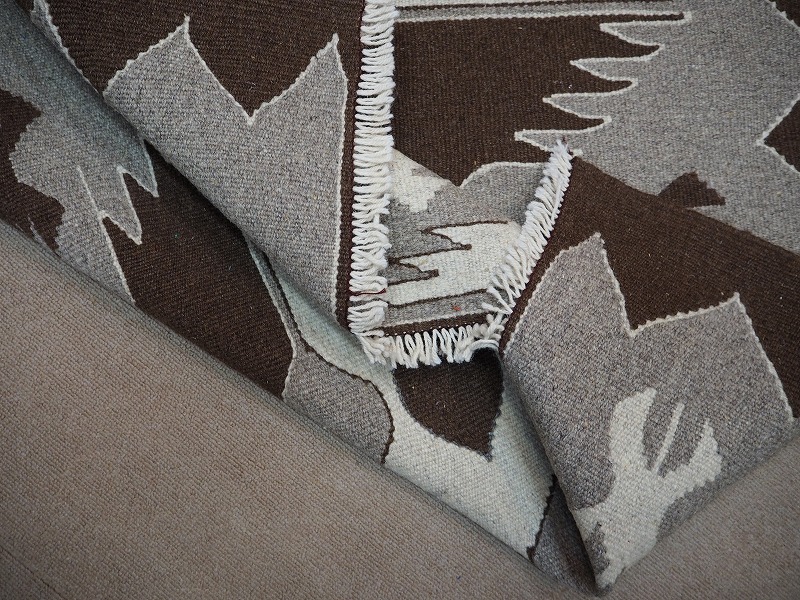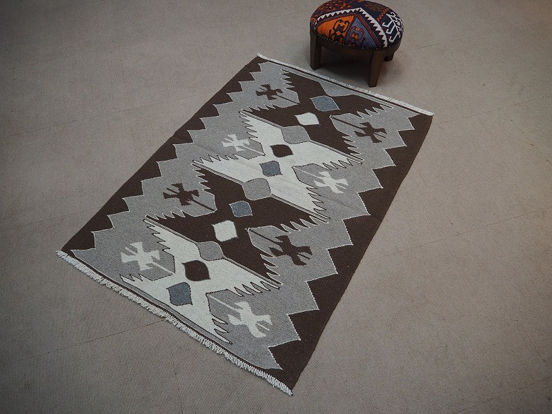 染めていないナチュラルな羊の毛の色だけを使って織られたモノトーンのキリム。こげ茶色、茶色、グレー、ベージュ、オフホワイトの組み合わせて、伝統的なキリムになっています。モダンなお部屋にもあわせやすい人気のカラーです。織りは、細かく隙間のない状態になっています。機械織りとは異なり、暖かみが伝わるハンドメイド。このタイプのものは、なかなか数が少なく、品質・価格・品揃え共に、日本国内屈指であると自負しています。