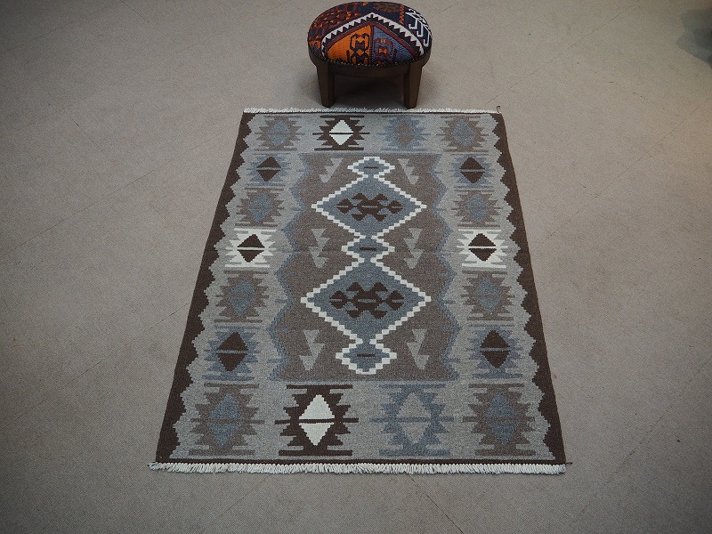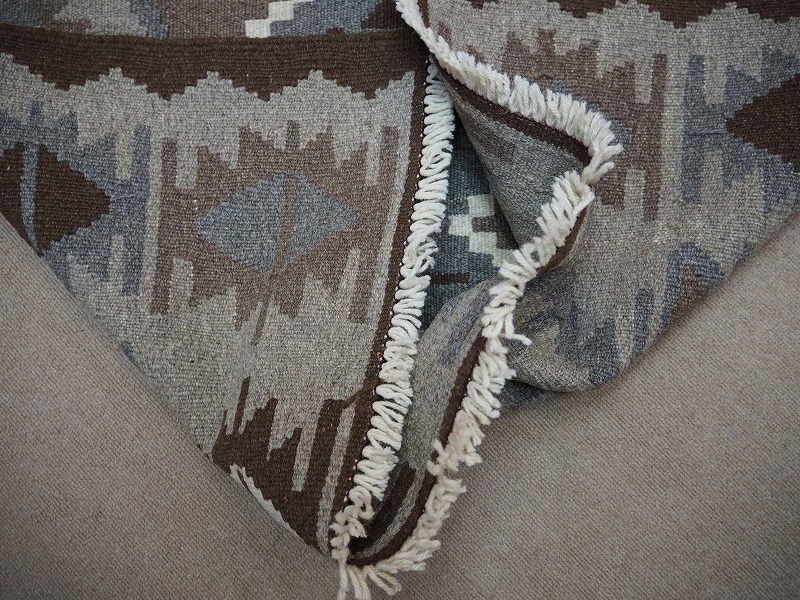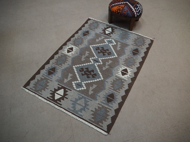 染めていないナチュラルな羊の毛の色だけを使って織られたモノトーンのキリム。こげ茶色、茶色、グレー、ベージュ、オフホワイトの組み合わせて、伝統的なキリムになっています。モダンなお部屋にもあわせやすい人気のカラーです。織りは、細かく隙間のない状態になっています。機械織りとは異なり、暖かみが伝わるハンドメイド。このタイプのものは、なかなか数が少なく、品質・価格・品揃え共に、日本国内屈指であると自負しています。