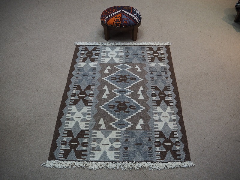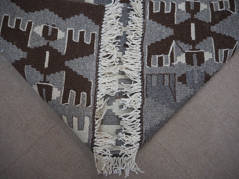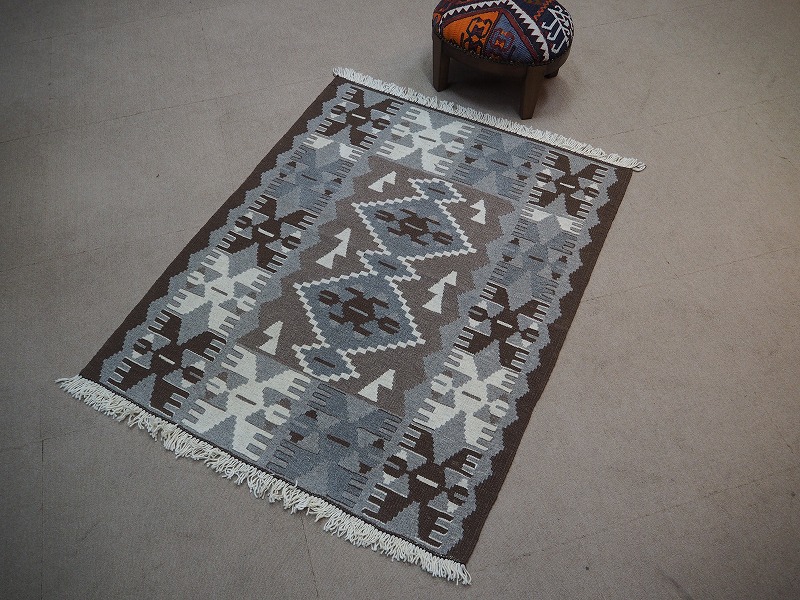 染めていないナチュラルな羊の毛の色だけを使って織られたモノトーンのキリム。こげ茶色、茶色、グレー、ベージュ、オフホワイトの組み合わせて、伝統的なキリムになっています。モダンなお部屋にもあわせやすい人気のカラーです。織りは、細かく隙間のない状態になっています。機械織りとは異なり、暖かみが伝わるハンドメイド。このタイプのものは、なかなか数が少なく、品質・価格・品揃え共に、日本国内屈指であると自負しています。
