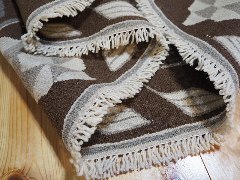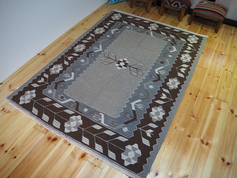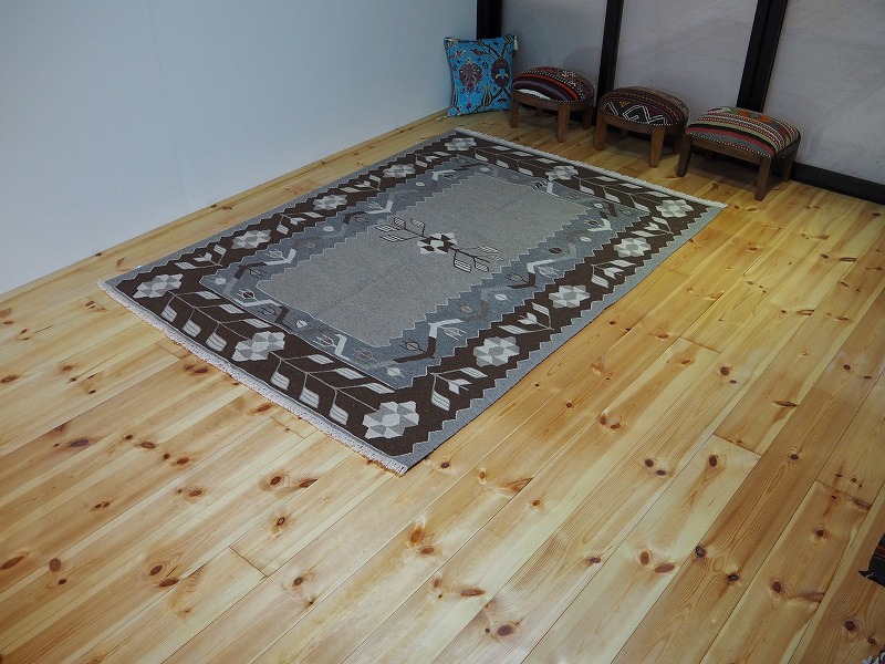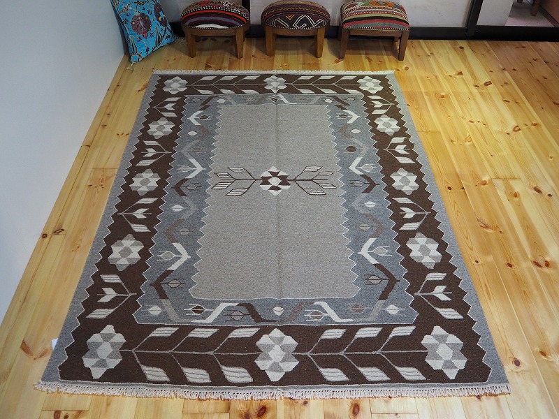 染めていないナチュラルな羊の毛の色だけを使って織られたモノトーンのキリム。こげ茶色、茶色、グレー、ベージュ、オフホワイトの組み合わせて、伝統的なキリムになっています。モダンなお部屋にもあわせやすい人気のカラーです。織りは、細かく隙間のない状態になっています。機械織りとは異なり、暖かみが伝わるハンドメイド。このタイプのものは、なかなか数が少なく、品質・価格・品揃え共に、日本国内屈指であると自負しています。