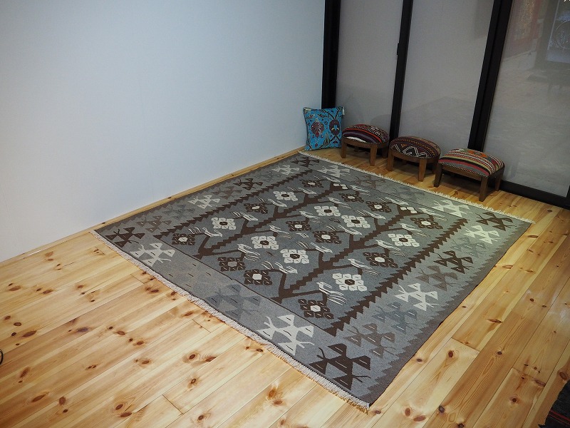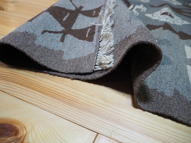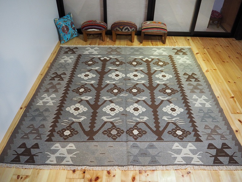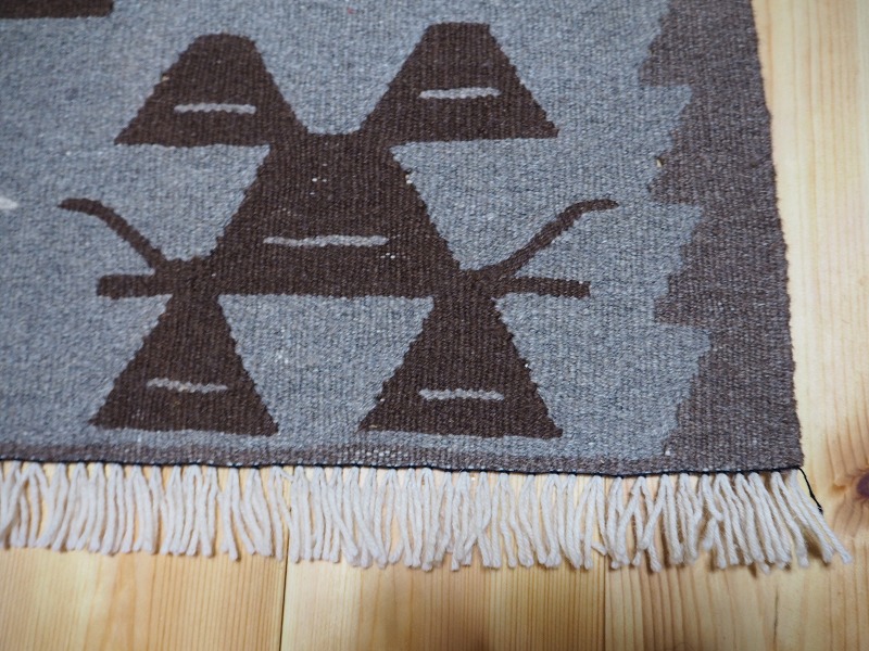 染めていないナチュラルな羊の毛の色だけを使って織られたモノトーンのキリム。こげ茶色、茶色、グレー、ベージュ、オフホワイトの組み合わせて、伝統的なキリムになっています。モダンなお部屋にもあわせやすい人気のカラーです。織りは、細かく隙間のない状態になっています。機械織りとは異なり、暖かみが伝わるハンドメイド。このタイプのものは、なかなか数が少なく、品質・価格・品揃え共に、日本国内屈指であると自負しています。