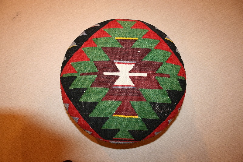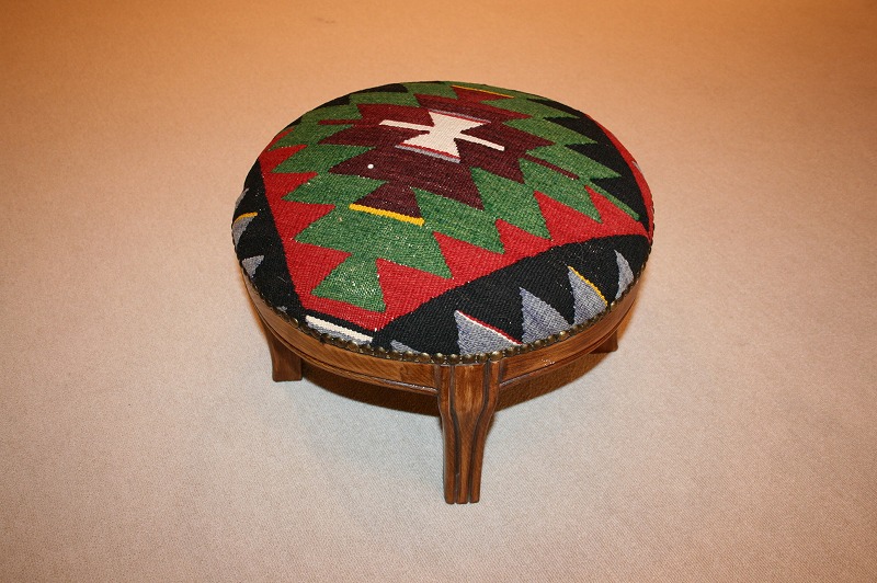 平織りの敷物・オールドキリムを張地にした椅子・オットマンチェアー。手織りの敷物からカットするため、すべて一点ものです。