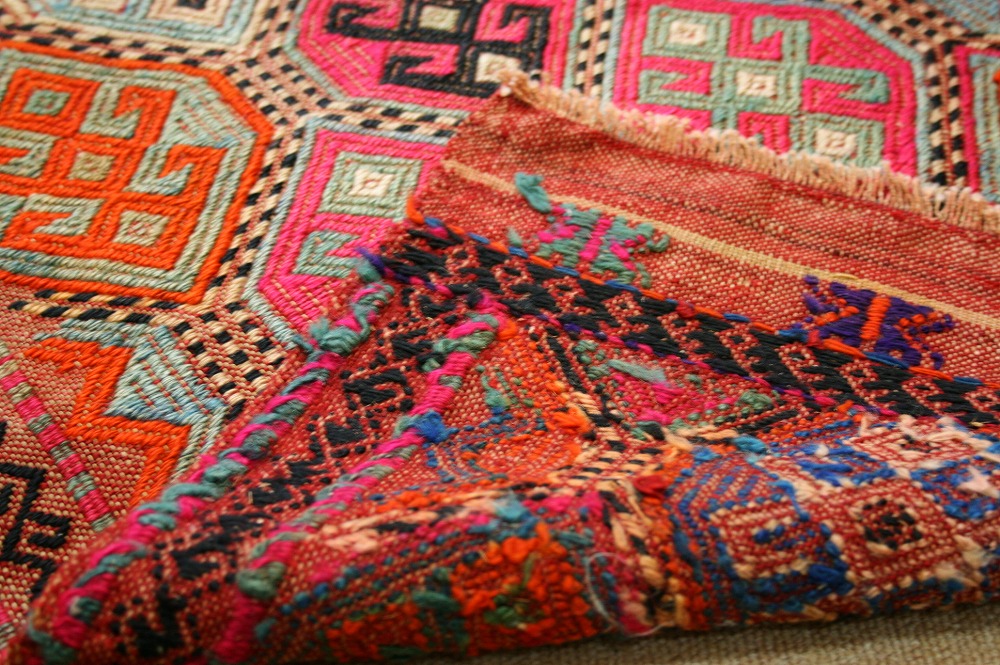 こちらはすばらしいジジムチュワルで、収納袋を開いたキリムです。すべて天然染料の草木染で、手織りで作られたものです。厚みがあり、とてもしっかりしています。