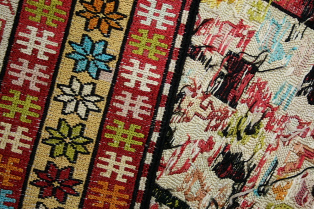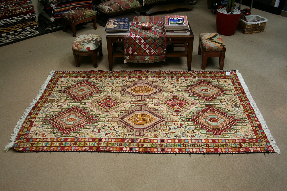 シルクキリム(スマック)シルクキリム(スマック)機械織りとは異なり、暖かみが伝わるハンドメイド、手織り。