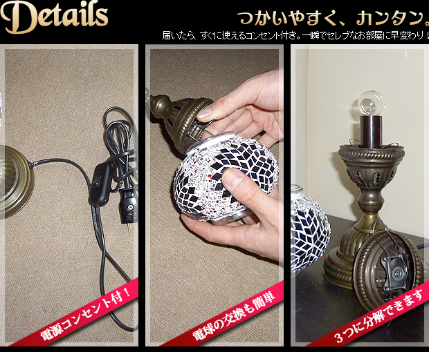 豪華で美麗なあかりを、あなたのお部屋に!古くからトルコに伝わる、伝統のデザイン、モザイクタイルを手作業で施したハンドメイド。そしてこのリーズナブルなプライス、どれをとっても大満足!お隣に差がつく、世界に1つの逸品です。