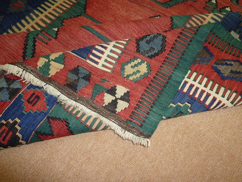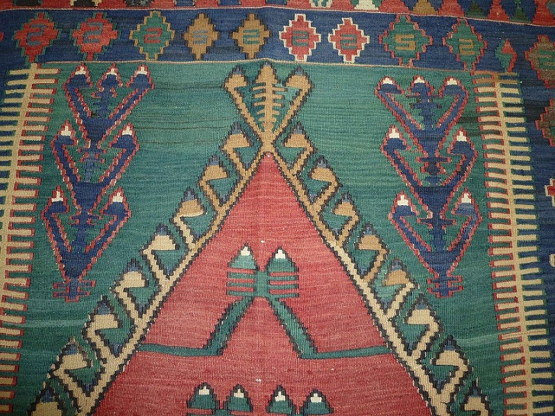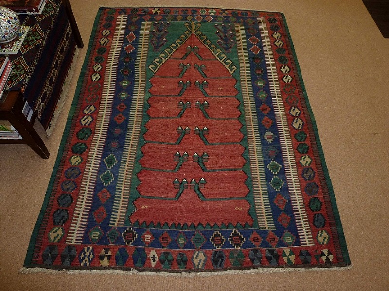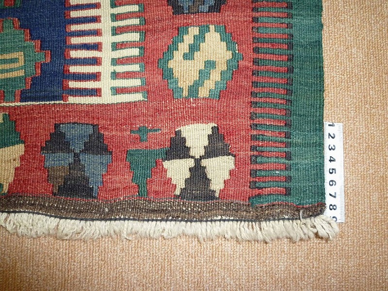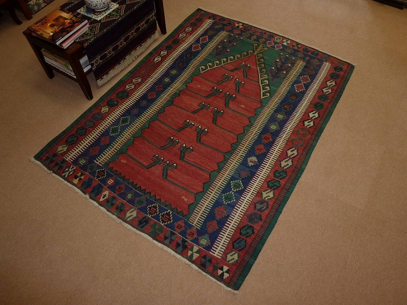 60~70年前のものです。繊細な織りと、大胆なデザインデと色彩。一枚あるだけで、オリジナリティあふれる空間をつくり出してくれます。本キリムに使用の糸は、すべて草木染めです。機械織りとは異なり、暖かみが伝わるハンドメイドです。