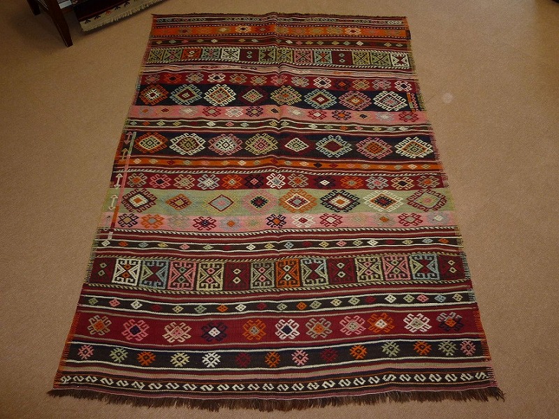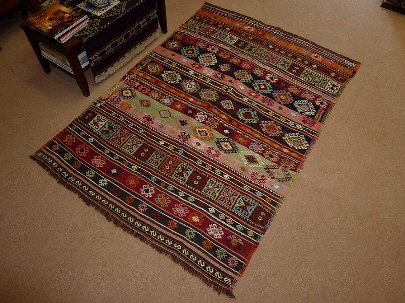 50~60年前のものです。繊細な織りと、大胆なデザインデと色彩。一枚あるだけで、オリジナリティあふれる空間をつくり出してくれます。本キリムに使用の糸は、すべて草木染めです。機械織りとは異なり、暖かみが伝わるハンドメイドです。使われた様子はなく、ダメージはありません。ふさの根元の部分は、横糸が出てこないように丁寧に仕上げています。
