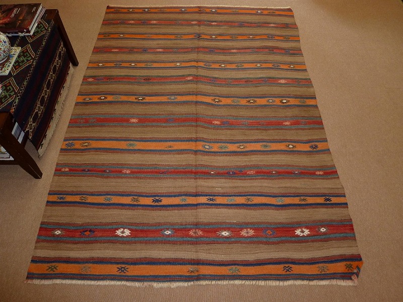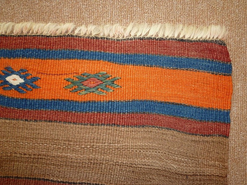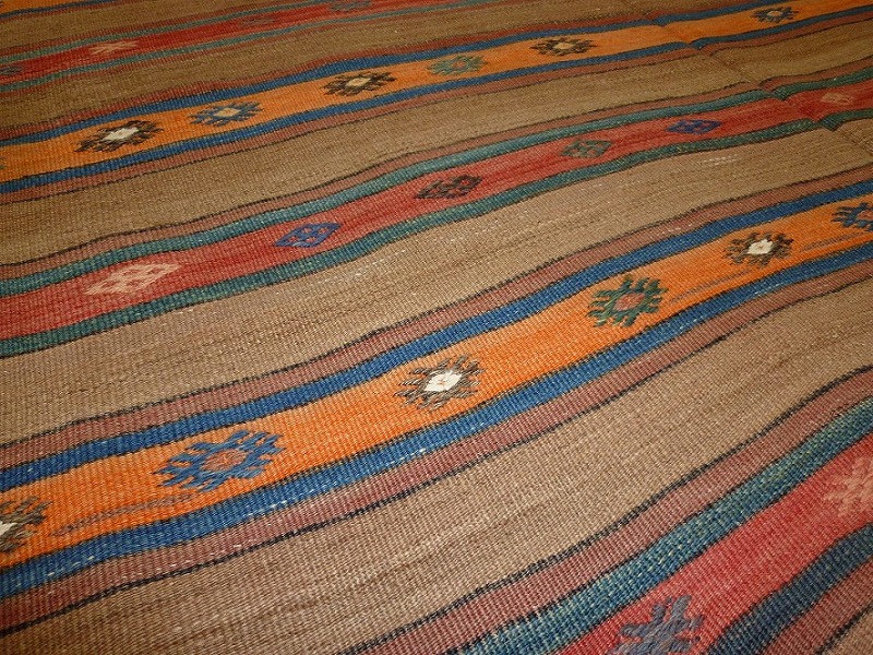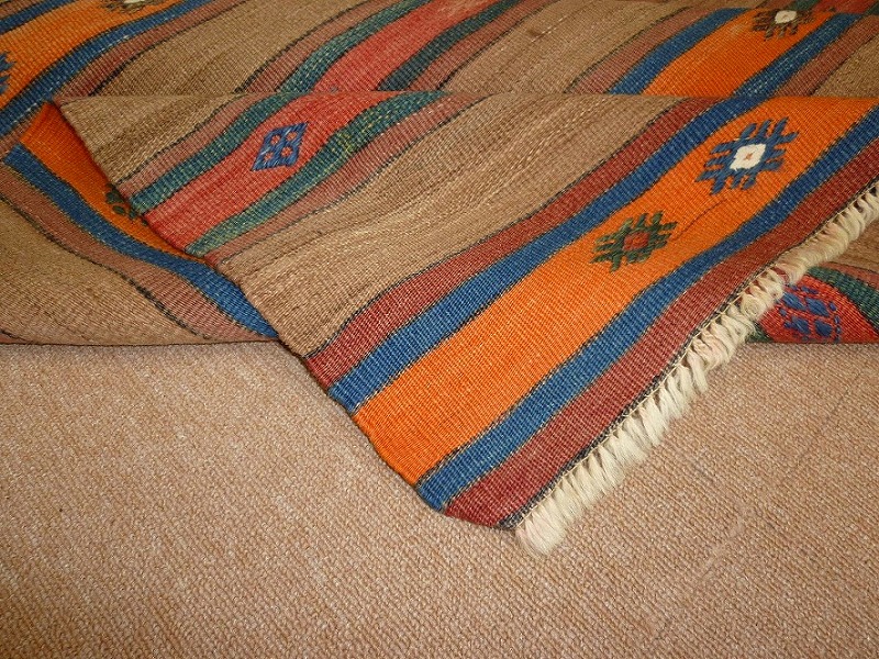 50~60年前のものです。繊細な織りと、大胆なデザインデと色彩。一枚あるだけで、オリジナリティあふれる空間をつくり出してくれます。本キリムに使用の糸は、すべて草木染めです。機械織りとは異なり、暖かみが伝わるハンドメイドです。使われた様子はなく、ほとんどダメージはありません。ふさの根元の部分は、横糸が出てこないように丁寧に仕上げています。リーズナブルなプライスでご満足いただけると思います。