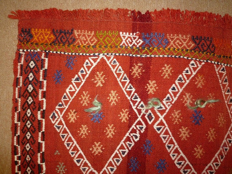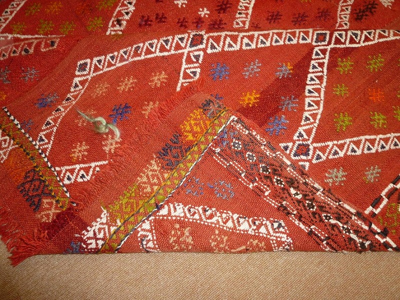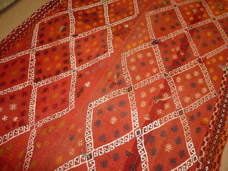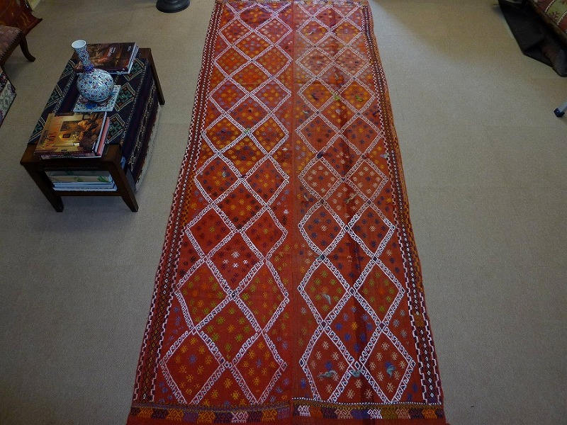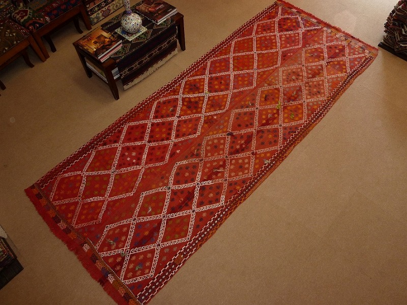 50~60年前のものです。繊細な織りと、大胆なデザインデと色彩。一枚あるだけで、オリジナリティあふれる空間をつくり出してくれます。本キリムに使用の糸は、すべて草木染めです。機械織りとは異なり、暖かみが伝わるハンドメイドです。使われた様子はなく、ほとんどダメージはありません。ふさの根元の部分は、横糸が出てこないように丁寧に仕上げています。リーズナブルなプライスでご満足いただけると思います。