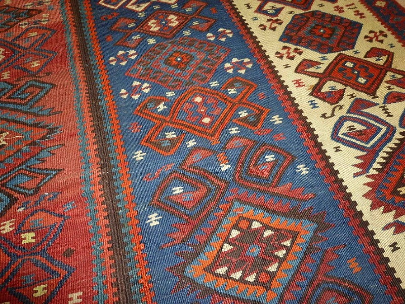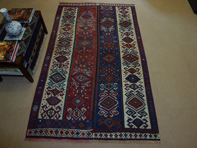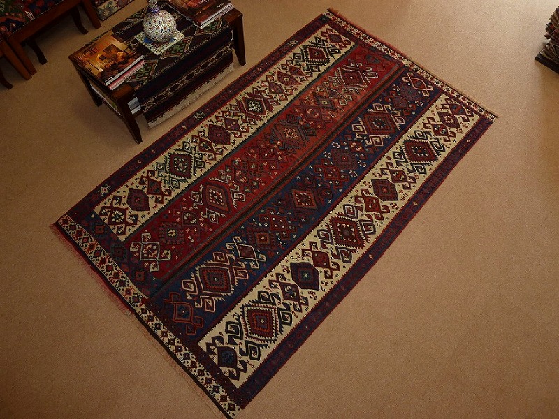50~60年前のものです。繊細な織りと、大胆なデザインデと色彩。一枚あるだけで、オリジナリティあふれる空間をつくり出してくれます。本キリムに使用の糸は、すべて草木染めです。機械織りとは異なり、暖かみが伝わるハンドメイドです。使われた様子はなく、ほとんどダメージはありません。ふさの根元の部分は、横糸が出てこないように丁寧に仕上げています。リーズナブルなプライスでご満足いただけると思います。