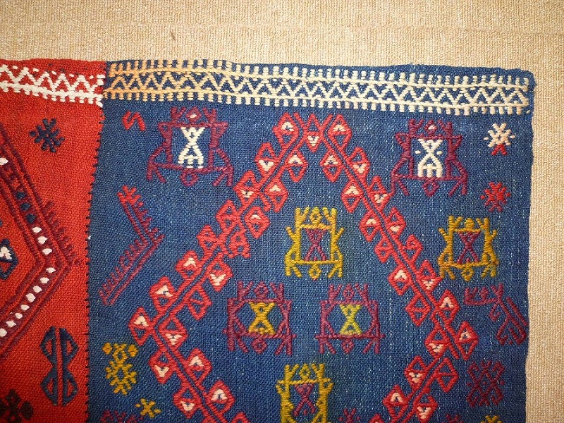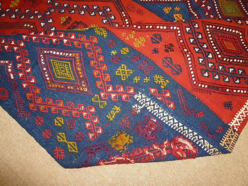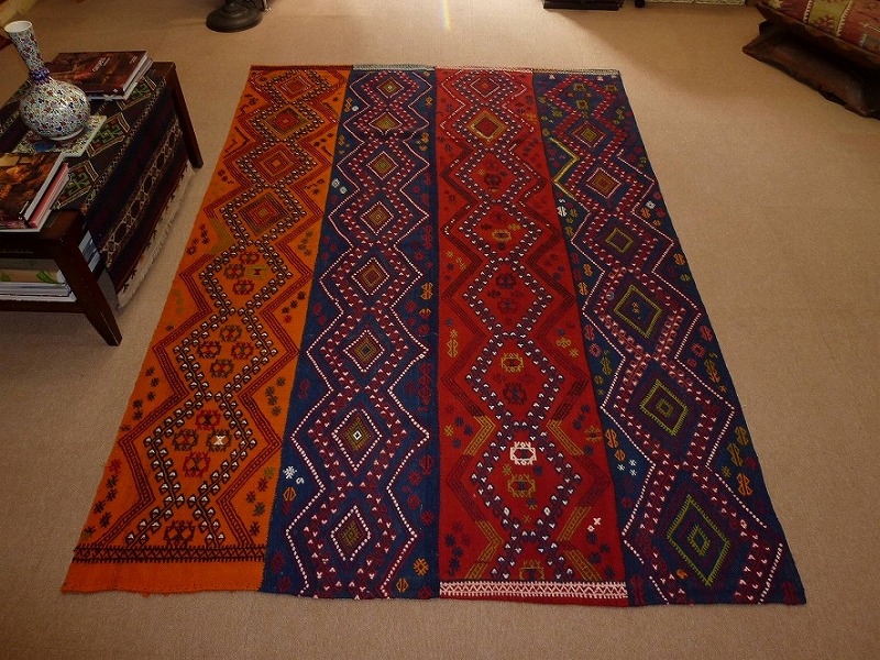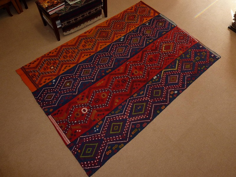 70~80年前のものです。繊細な織りと、大胆なデザインデと色彩。一枚あるだけで、オリジナリティあふれる空間をつくり出してくれます。本キリムに使用の糸は、すべて草木染めです。機械織りとは異なり、暖かみが伝わるハンドメイドです。使われた様子はなく、ほとんどダメージはありません。ふさの根元の部分は、横糸が出てこないように丁寧に仕上げています。リーズナブルなプライスでご満足いただけると思います。