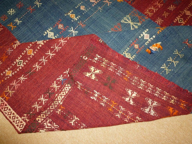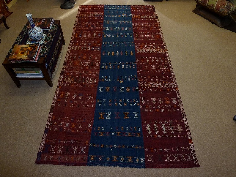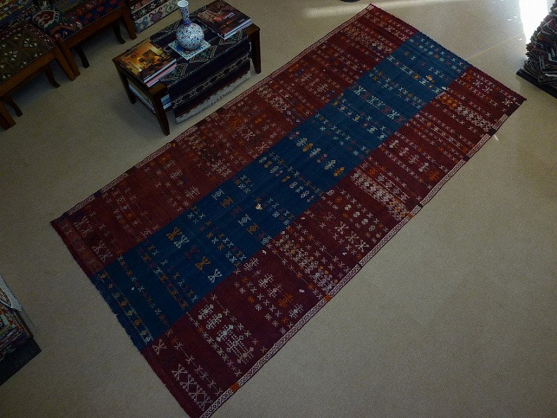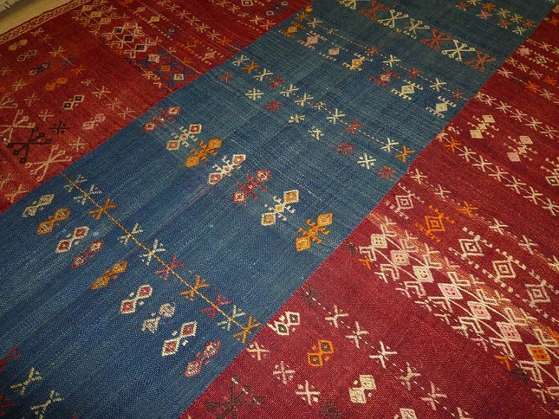 70~80年前のものです。繊細な織りと、大胆なデザインデと色彩。一枚あるだけで、オリジナリティあふれる空間をつくり出してくれます。本キリムに使用の糸は、すべて草木染めです。機械織りとは異なり、暖かみが伝わるハンドメイドです。使われた様子はなく、ほとんどダメージはありません。ふさの根元の部分は、横糸が出てこないように丁寧に仕上げています。リーズナブルなプライスでご満足いただけると思います。