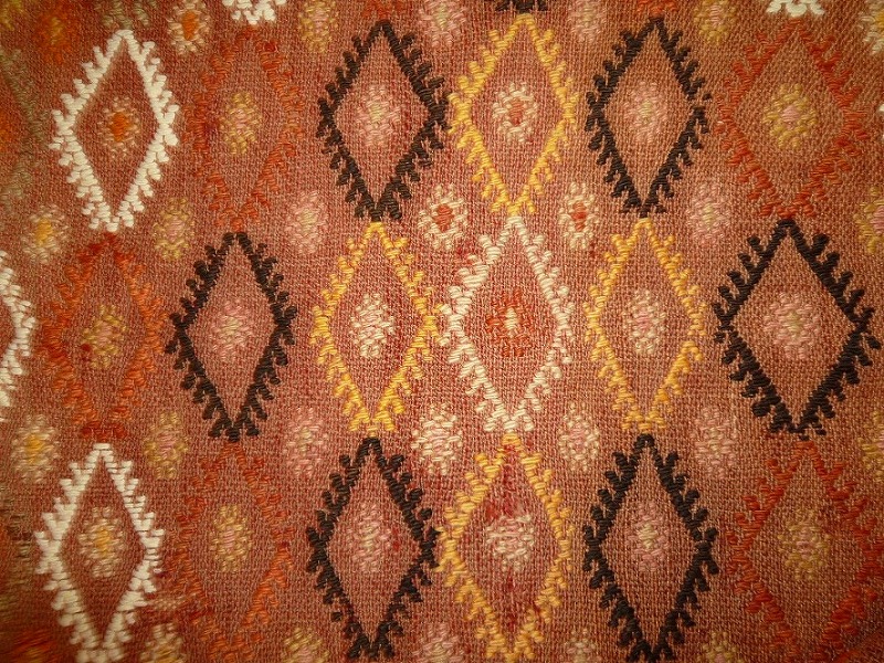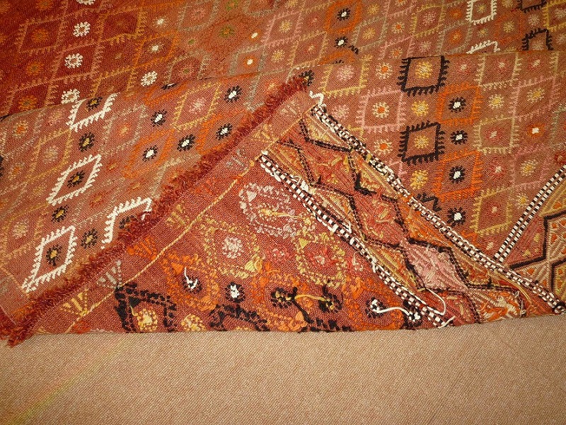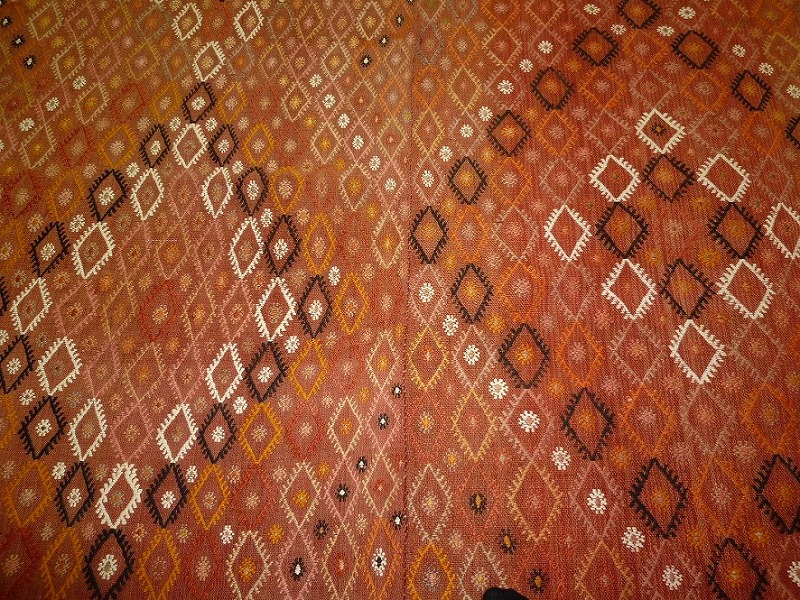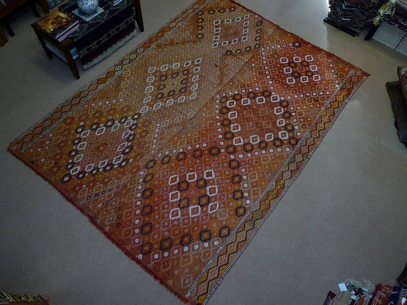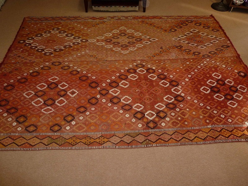 60~70年前のものです。繊細な織りと、大胆なデザインデと色彩。一枚あるだけで、オリジナリティあふれる空間をつくり出してくれます。本キリムに使用の糸は、すべて草木染めです。機械織りとは異なり、暖かみが伝わるハンドメイドです。使われた様子はなく、ほとんどダメージはありません。ふさの根元の部分は、横糸が出てこないように丁寧に仕上げています。リーズナブルなプライスでご満足いただけると思います。