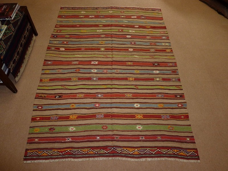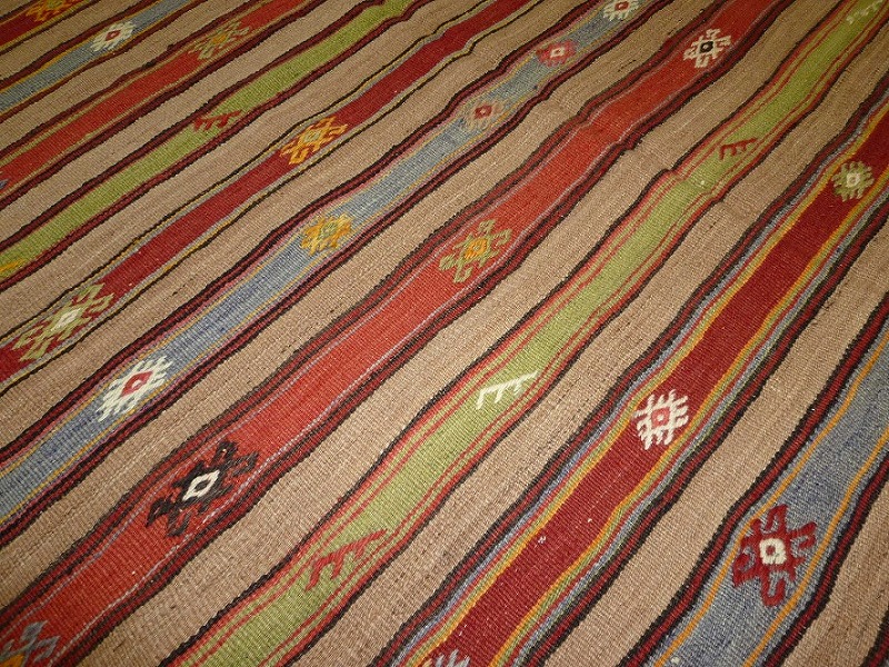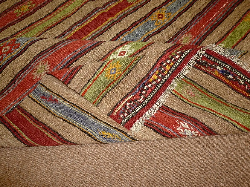 50~60年前のものです。繊細な織りと、大胆なデザインデと色彩。一枚あるだけで、オリジナリティあふれる空間をつくり出してくれます。本キリムに使用の糸は、すべて草木染めです。機械織りとは異なり、暖かみが伝わるハンドメイドです。使われた様子はなく、ほとんどダメージはありません。ふさの根元の部分は、横糸が出てこないように丁寧に仕上げています。リーズナブルなプライスでご満足いただけると思います。