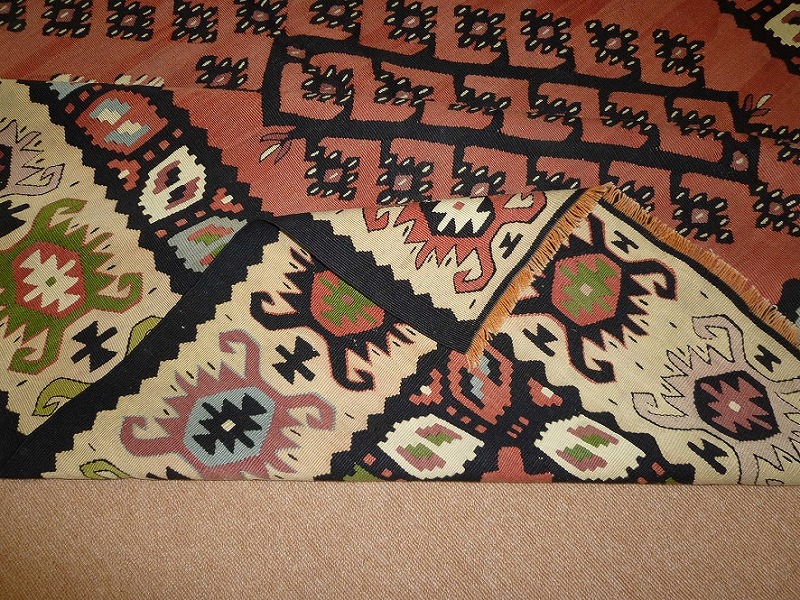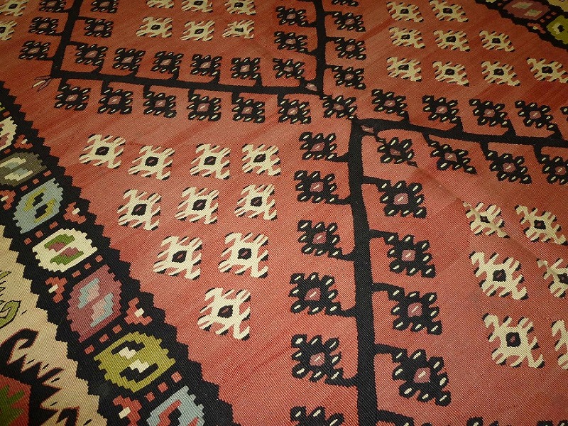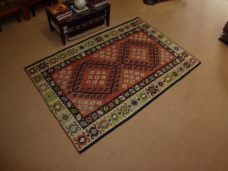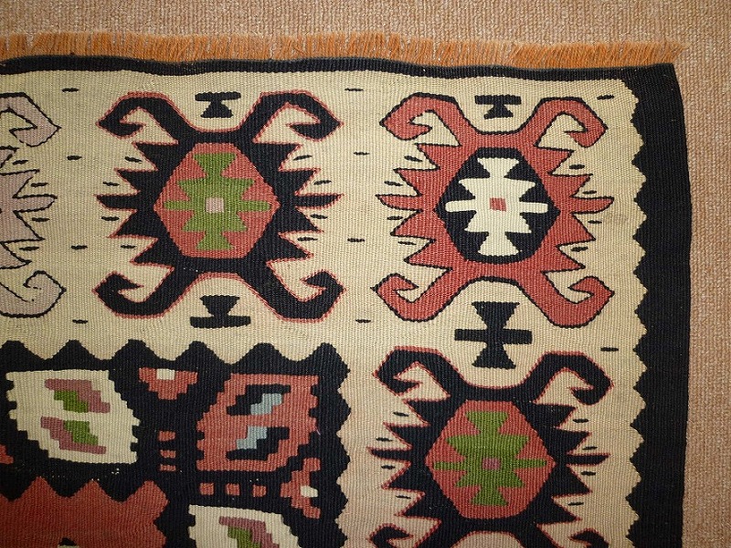 50~60年前のものです。繊細な織りと、大胆なデザインデと色彩。一枚あるだけで、オリジナリティあふれる空間をつくり出してくれます。本キリムに使用の糸は、すべて草木染めです。機械織りとは異なり、暖かみが伝わるハンドメイドです。使われた様子はなく、ほとんどダメージはありません。ふさの根元の部分は、横糸が出てこないように丁寧に仕上げています。リーズナブルなプライスでご満足いただけると思います。