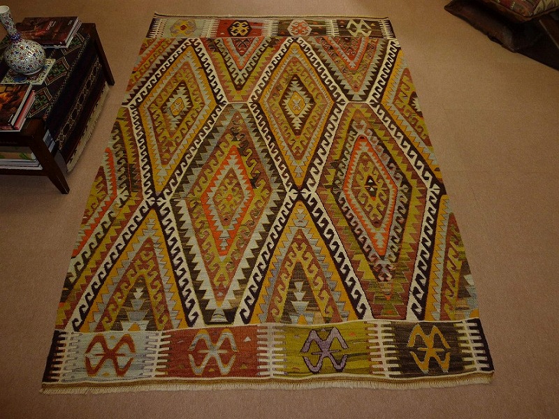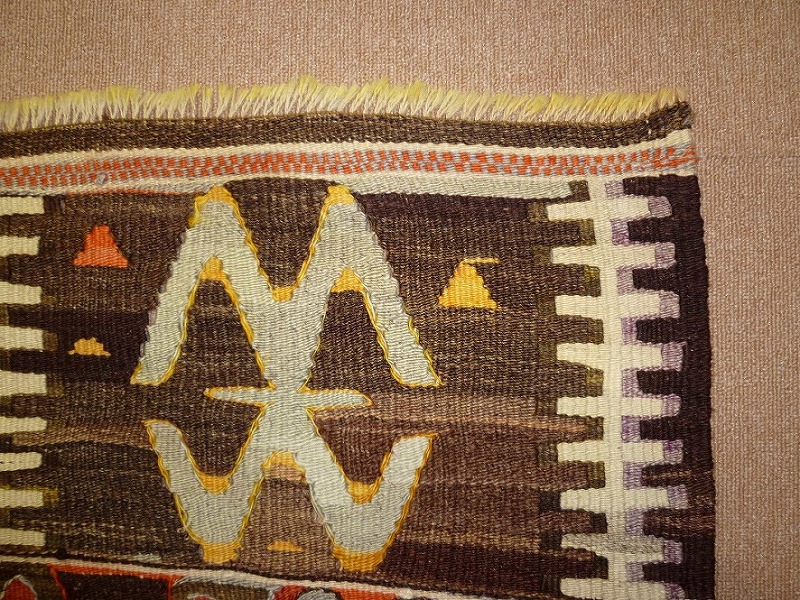 50~60年前のものです。繊細な織りと、大胆なデザインデと色彩。一枚あるだけで、オリジナリティあふれる空間をつくり出してくれます。本キリムに使用の糸は、すべて草木染めです。機械織りとは異なり、暖かみが伝わるハンドメイドです。使われた様子はなく、ほとんどダメージはありません。ふさの根元の部分は、横糸が出てこないように丁寧に仕上げています。リーズナブルなプライスでご満足いただけると思います。