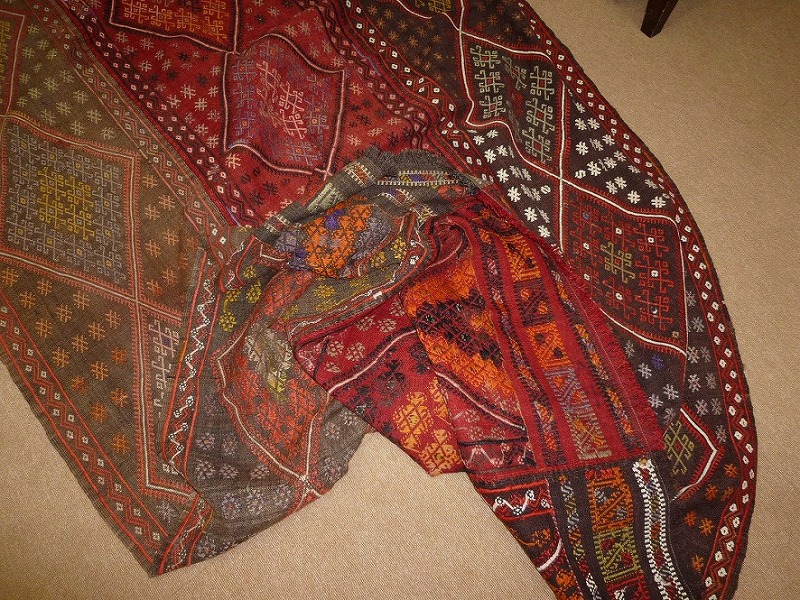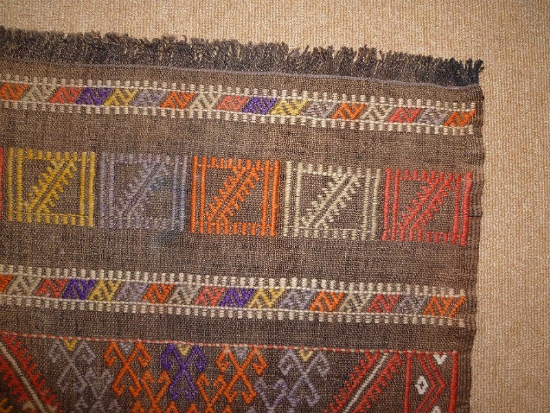 80~90年前のものです。繊細な織りと、大胆なデザインデと色彩。一枚あるだけで、オリジナリティあふれる空間をつくり出してくれます。本キリムに使用の糸は、すべて草木染めです。機械織りとは異なり、暖かみが伝わるハンドメイドです。使われた様子はなく、ほとんどダメージはありません。ふさの根元の部分は、横糸が出てこないように丁寧に仕上げています。リーズナブルなプライスでご満足いただけると思います。