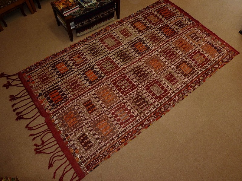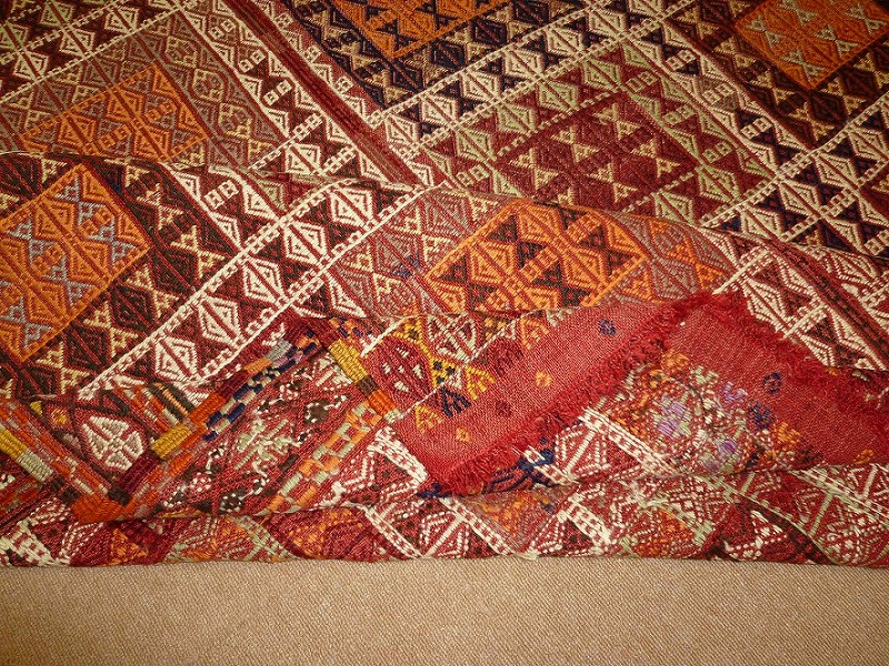 80~90年前のものです。繊細な織りと、大胆なデザインデと色彩。一枚あるだけで、オリジナリティあふれる空間をつくり出してくれます。本キリムに使用の糸は、すべて草木染めです。機械織りとは異なり、暖かみが伝わるハンドメイドです。使われた様子はなく、ほとんどダメージはありません。ふさの根元の部分は、横糸が出てこないように丁寧に仕上げています。リーズナブルなプライスでご満足いただけると思います。